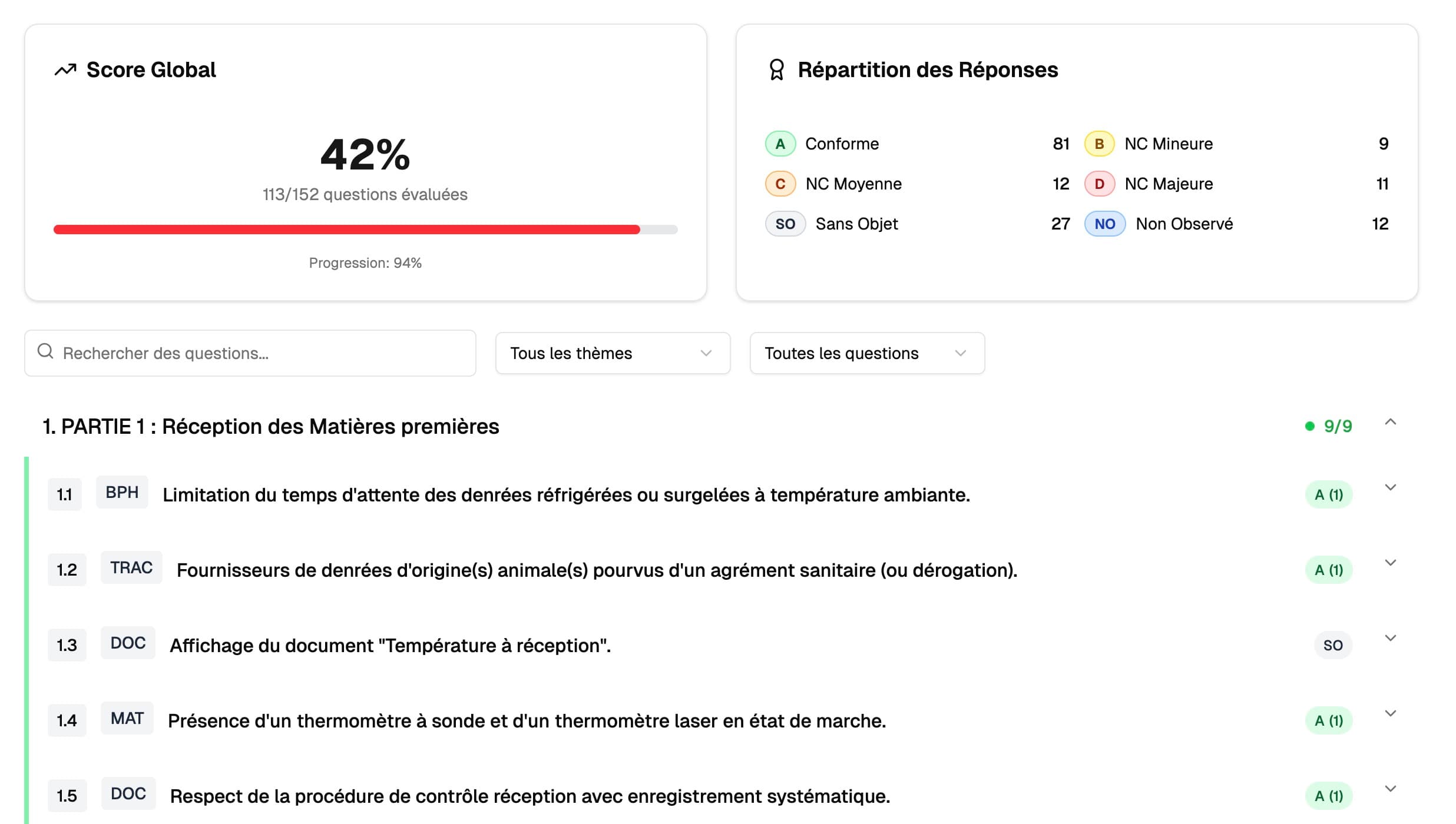 Chaque reponse est notee de A (conforme) a D (non-conformite majeure). Le score global est calcule automatiquement en fonction des ponderations. Vous pouvez aussi voir le score par theme.
